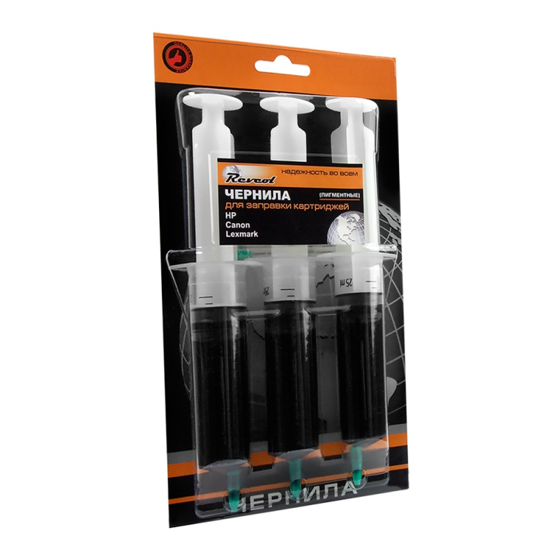 Заправочный набор Revcol, для HP, Canon, Lexmark, Black, Pigment, 3 шприца по 20 мл.