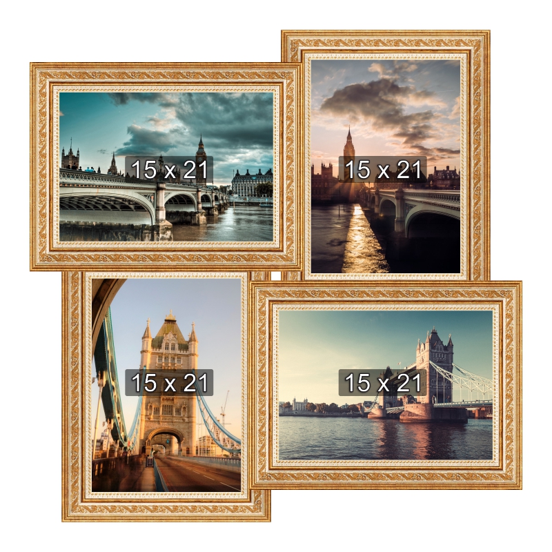 43 x 43 см. / 4 рамки 15 х 21 см., 56 x 42 см. / 4 рамки 10 х 15 см. и 1 рамка 20 х 30 см., 58 x 30 см. / 8 рамок 10 х 15 см., 58 x 53 см. / 8 рамок 10 х 15 см., 65 x 54 см. / 5 рамок 10 х 15 см., 2 рамки 15 х 21 см и 1 рамка 20 х 30 см., 65 x 62 см. / 6 рамок 10 х 15 см. и 2 рамки 20 х 30 см.