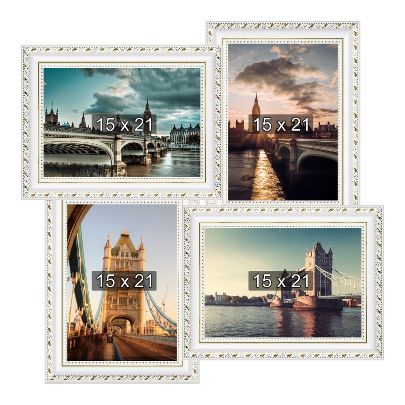 43 x 43 см. / 4 рамки 15 х 21 см., 56 x 42 см. / 4 рамки 10 х 15 см. и 1 рамка 20 х 30 см., 58 x 30 см. / 8 рамок 10 х 15 см., 58 x 53 см. / 8 рамок 10 х 15 см., 65 x 54 см. / 5 рамок 10 х 15 см., 2 рамки 15 х 21 см и 1 рамка 20 х 30 см., 65 x 62 см. / 6 рамок 10 х 15 см. и 2 рамки 20 х 30 см.