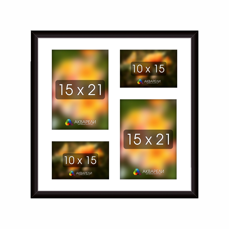 | Размер / кол-во фото | 40 х 19 см. / 3 фото 10 х 15 см., 40 х 40 см. / 2 фото 15 х 21 см. + 2 фото 10 х 15 см., 44 х 40 см. / 7 фото 10 х 15 см., 53 х 35 см. / 6 фото 10 х 15 см., 60 х 30 см. / 3 фото 15 х 21 см. |