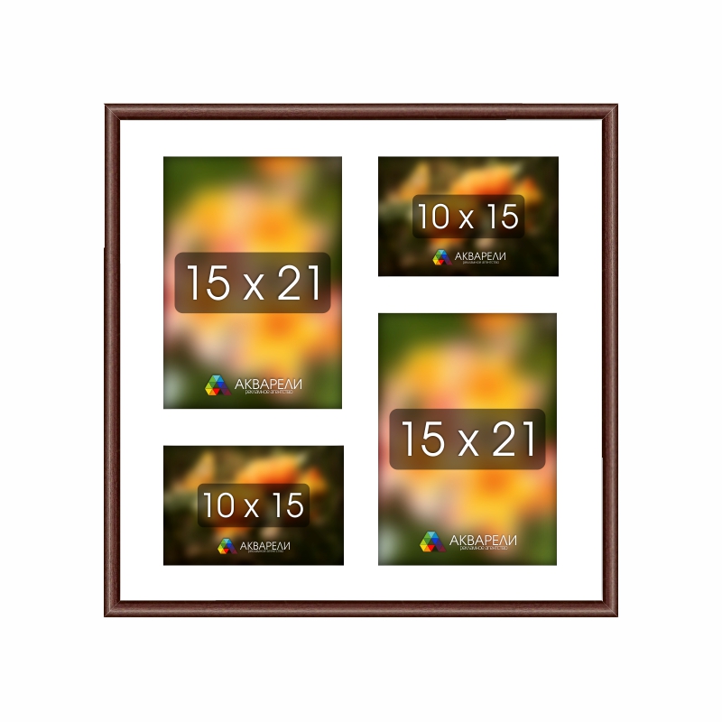 | Размер / кол-во фото | 40 х 19 см. / 3 фото 10 х 15 см., 40 х 40 см. / 2 фото 15 х 21 см. + 2 фото 10 х 15 см., 44 х 40 см. / 7 фото 10 х 15 см., 53 х 35 см. / 6 фото 10 х 15 см., 60 х 30 см. / 3 фото 15 х 21 см. |