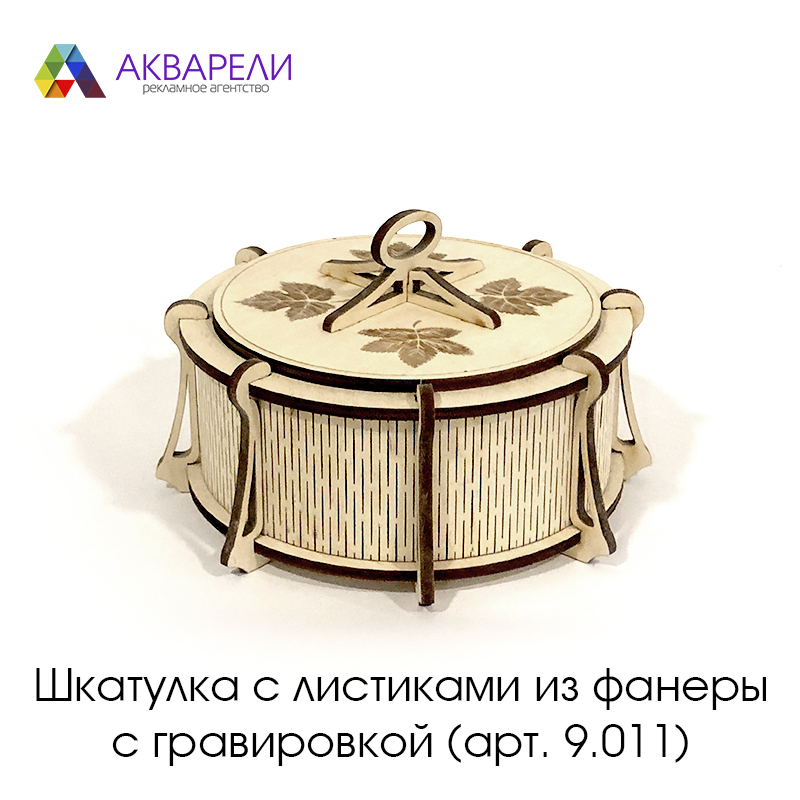 Круглая шкатулка с крышкой, на которой выгравированы листья.